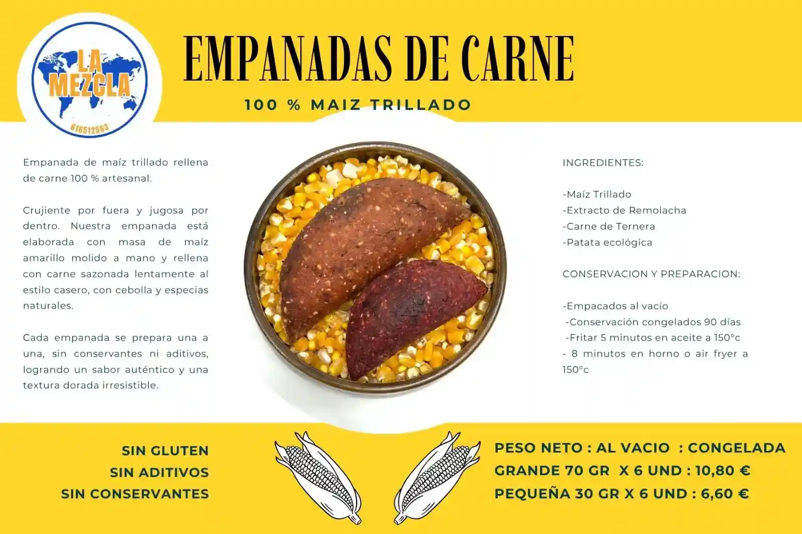 Empanadas de maíz trillado gluten free, teñidas con colorantes naturales, rellenas de carne cocinada a baja temperatura con un puré de patatas y un sofrito de cebolla, tomate y hierbas naturales. Nota Pueden ir listas para comer fritas en aceite o en freidora de aire caliente o si lo prefieren congeladas y empacadas al vacío para comerlas cuando lo deseen ! Todas nuestras empanadas incluyen en ají ( picante)