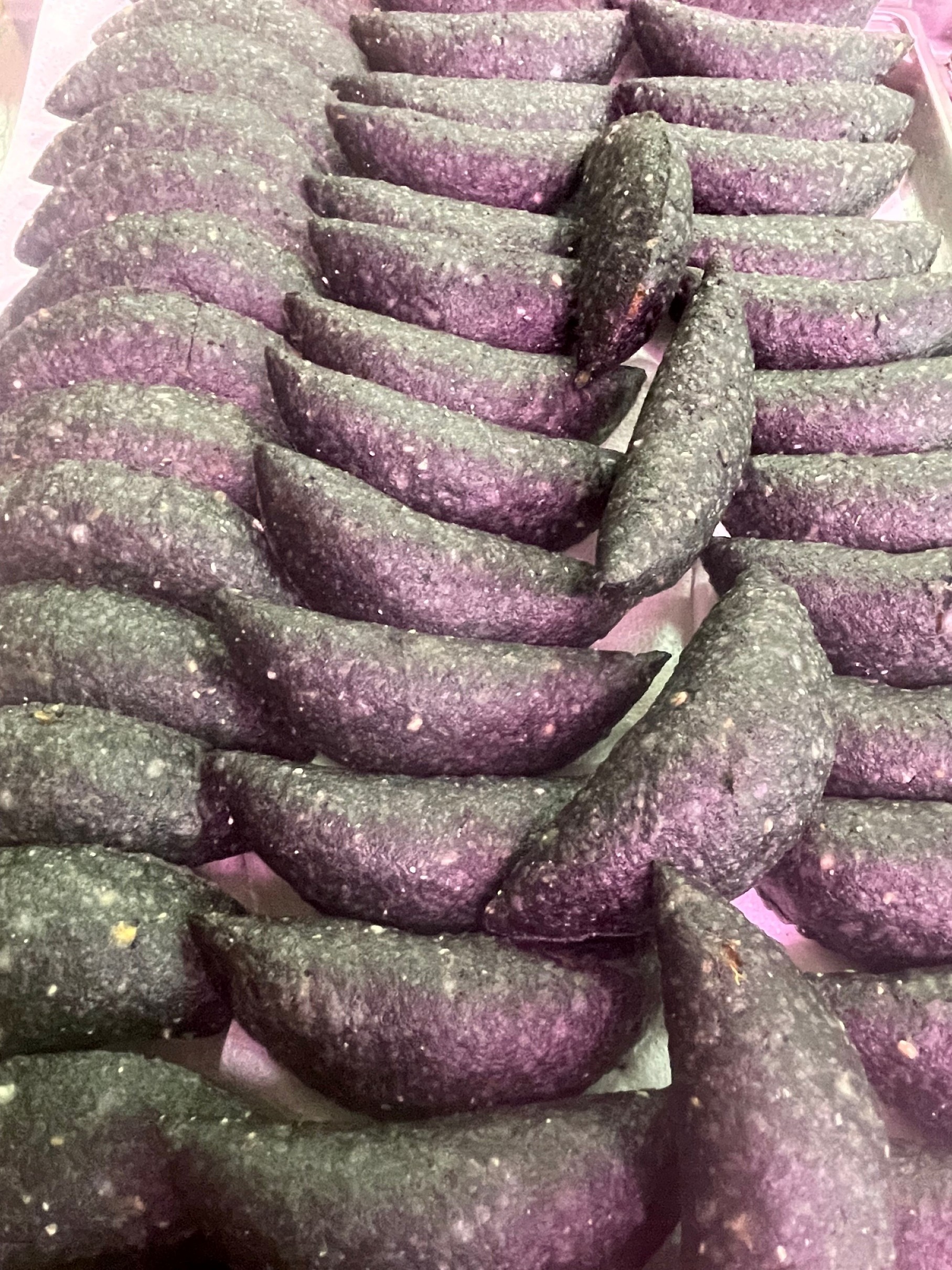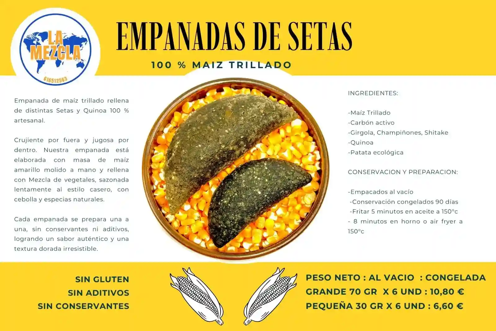 Empanadas de setas negras de maíz trillado, teñidas con productos naturales rellenas de quinoa roja, blanca, setas niponas ( shiitakes , shimejis),girgolas, champiñones, sofrito de cebolla y un suave puré de patatas con aroma de aceite de trufas.